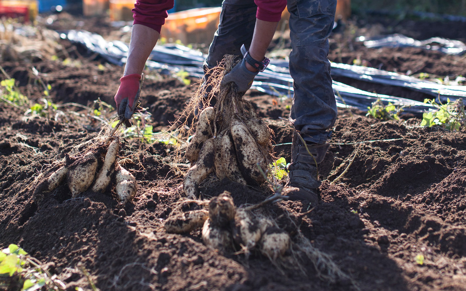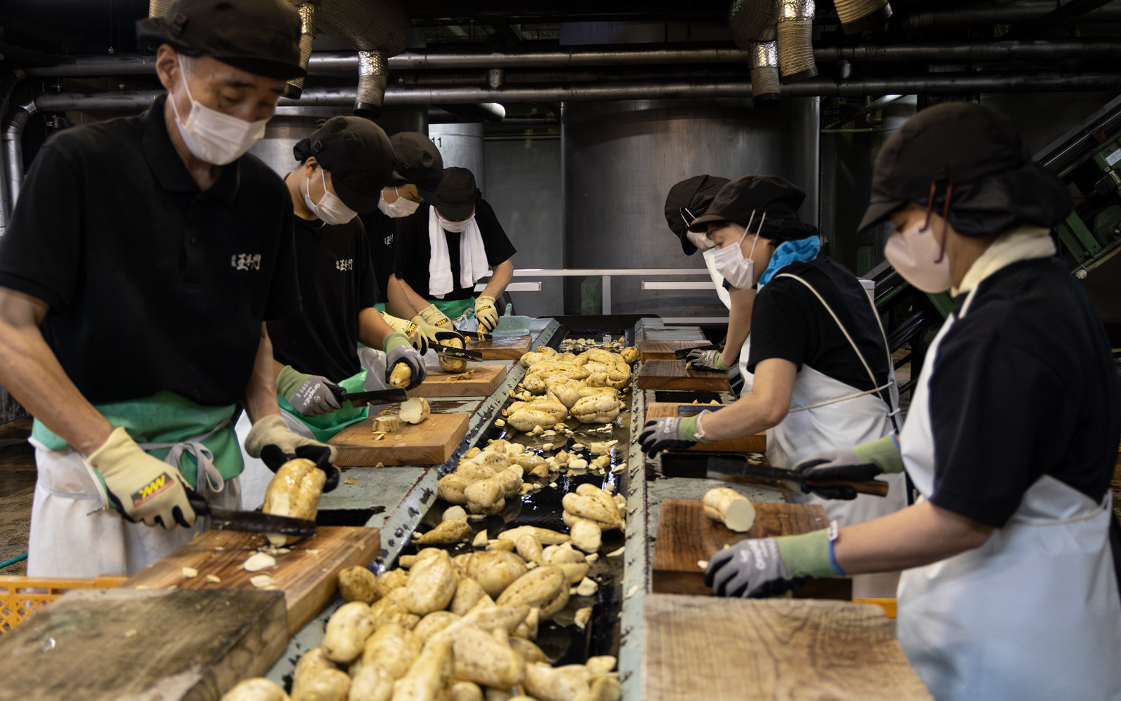 At Sakagura Ohtemon, various types of potatoes such as “Kogane Sengan” and “Beni Kotobuki” are carefully cultivated by dedicated Miyazaki farmers to serve as the raw materials for Imo Shochu. After harvest, the potatoes undergo a meticulous process of sorting and washing to prepare them for the potato cutting stage, where they will be transformed into raw materials.
