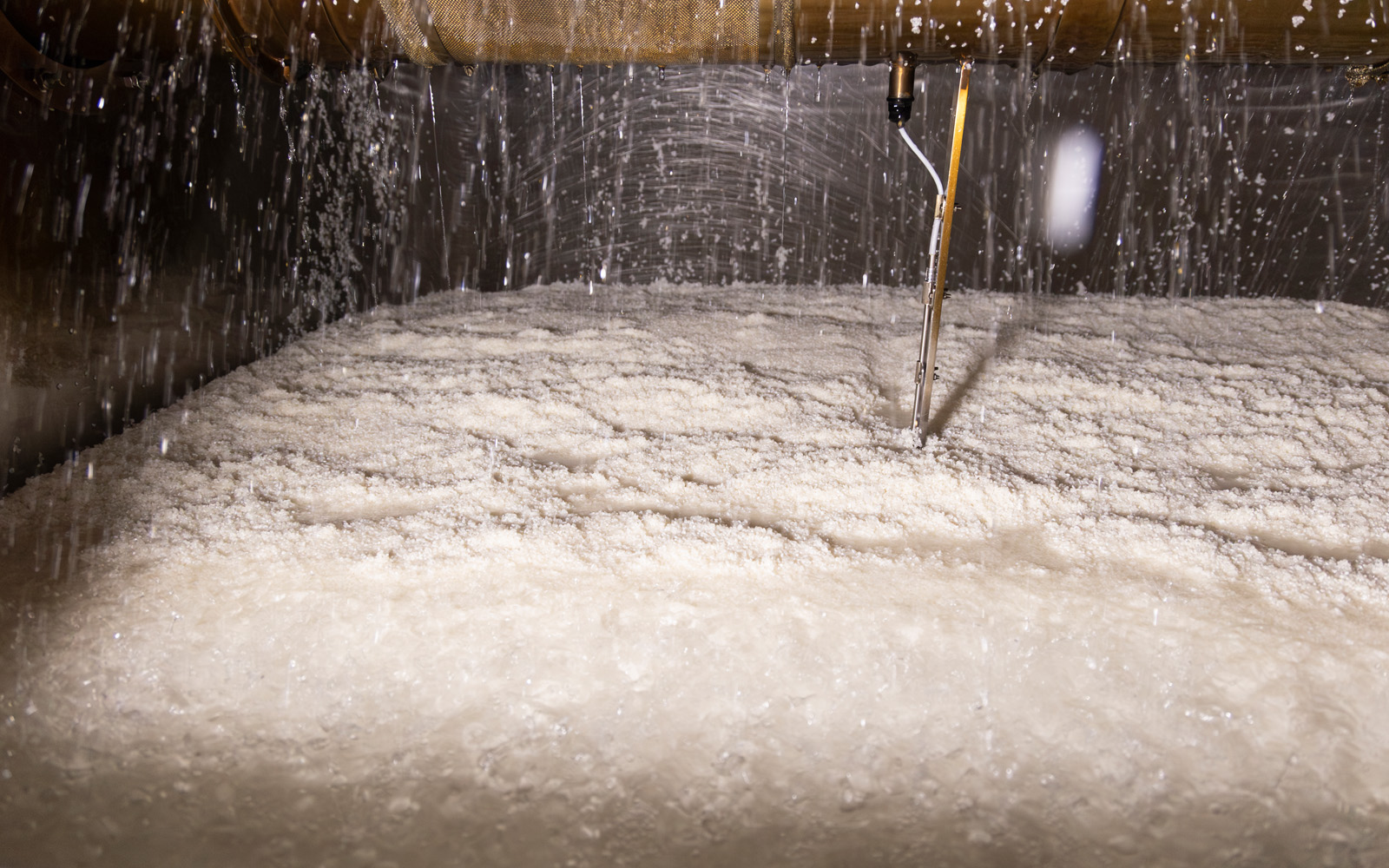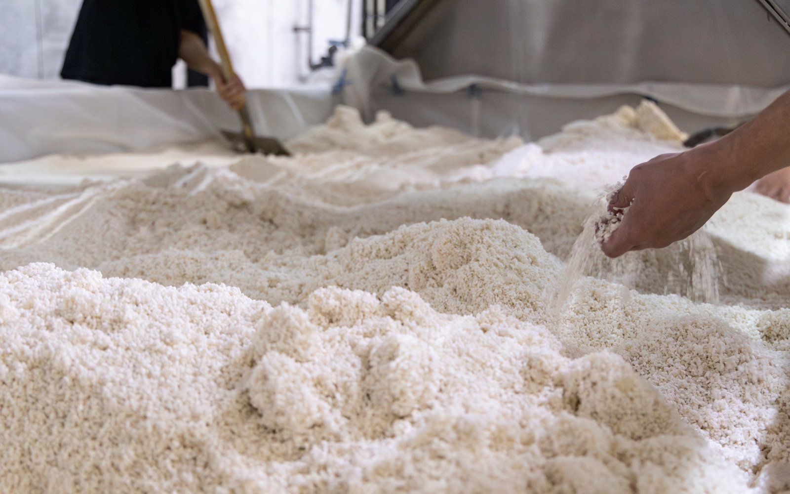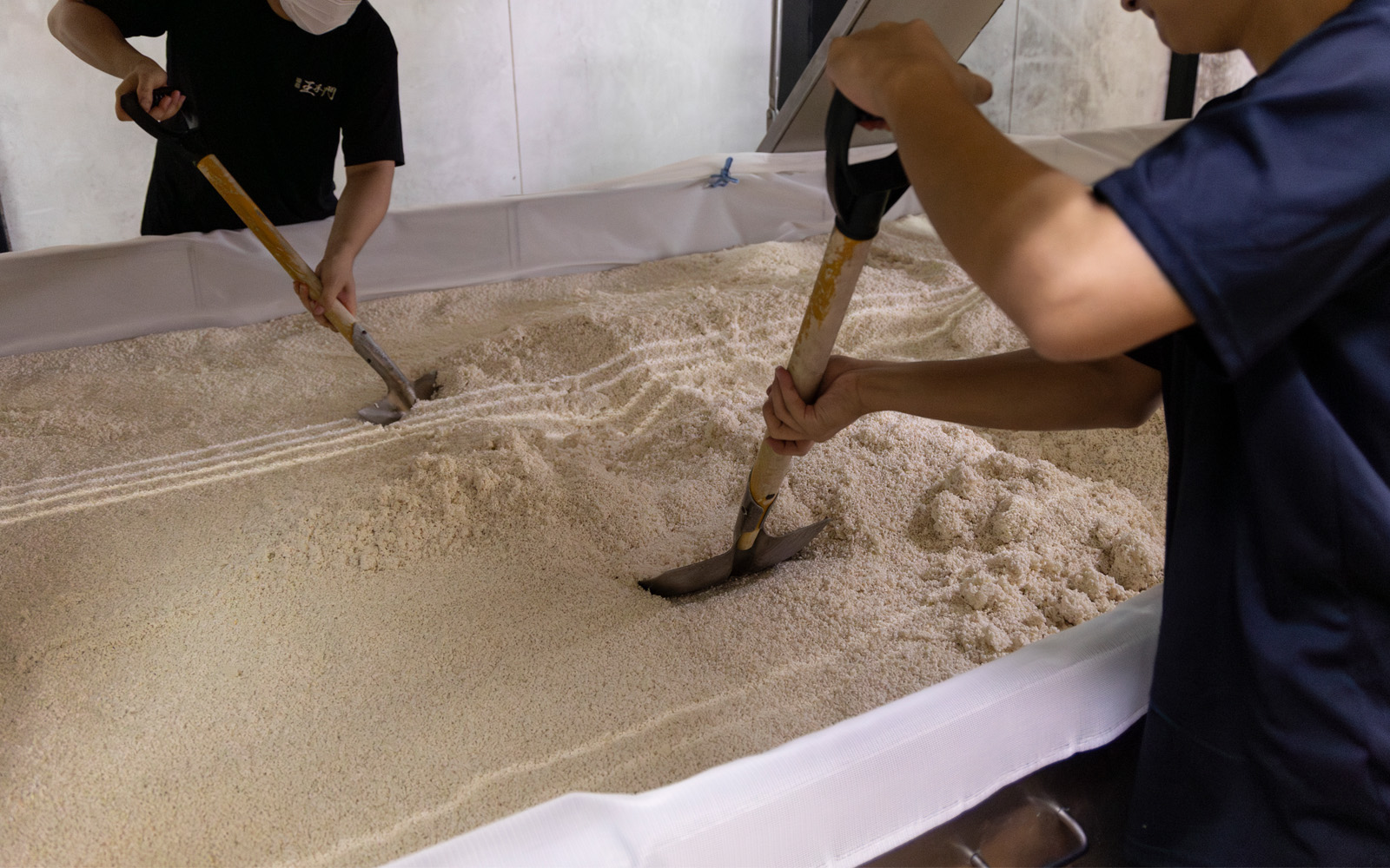 - Once a certain temperature (specified temperature) is reached, the koji spores are sprinkled to initiate the koji fermentation process, carried out by koji molds (white/black).